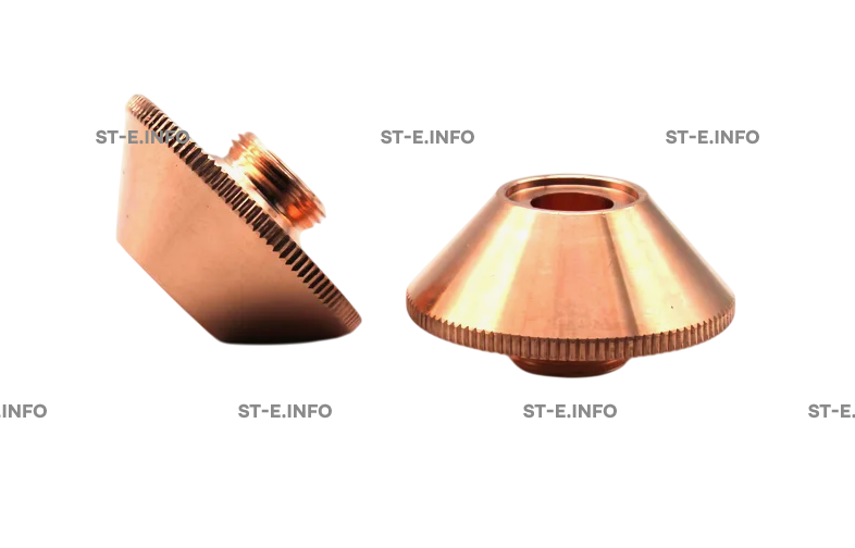 Данное сопло имеет форму усеченного конуса и диаметр отверстия на выходе. Произведено из меди с соблюдением необходимых стандартов качества, технических параметров изделий данного типа. В результате применения, сопло гарантирует сохранение расчётных параметров в течение длительного времени, вдобавок обеспечивает высокую мощность работы оборудования лазерной резки.