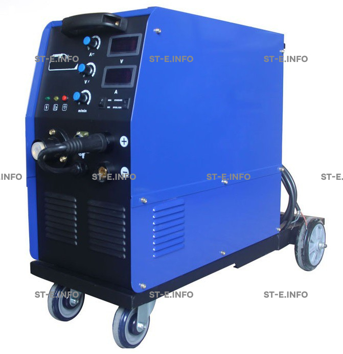 Аппарат переключает режимы работы MMA/MIG (РД/МП) осуществляется тумблером на передней панели, на передней панели также установлен интуитивно понятный механизм переключения полярности тока, а также набор регуляторов напряжения дуги и сварочного тока, и их цифровые индикаторы. Под крышкой корпуса расположен двухроликовый механизм подачи, предназначенный для установки кассет с проволокой, под крышкой также скрыт регулятор длины вылета проволоки. Корпус выполнен на колесах, а в задней части источника питания установлена площадка под баллон с защитным газом.